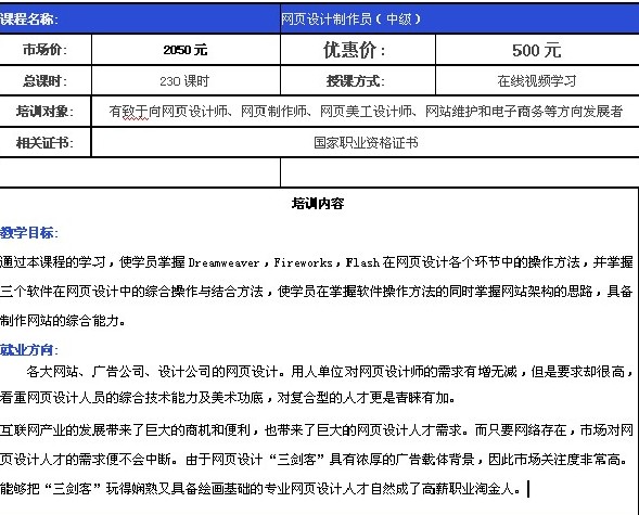 上海师范大学数理学院培训部隶属于上海师范大学二级学院---数理学院,学院培训部依靠学校雄厚的师资力量,通过优化配置教学资源,坚持以培训基础扎实,知识面宽,动手能力强的应用型人才为宗旨,以学生为本,以教学为中心的办学理念,科研为先导的办学原则,以IT培训和服务为主要技能培训的专业培训机构。 项目名称:网页设计制作员中级 培训内容:使学员具备制作网站综合能力