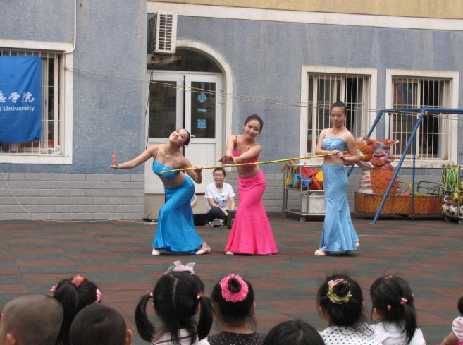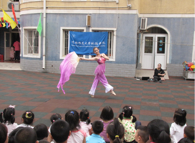 首都师范大学科德学院学前教育专业经过紧张的排练,走上了与学院合作的各个幼儿园的舞台,在展示自己才华和专业知识的同时和幼儿园的小朋友一起愉快地度过了六一儿童节。