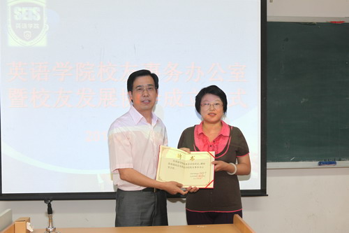 首先张春霞老师介绍了目前英语学院校友工作情况,以及英语学院校友事务办公室成立方案及工作计划。之后孙有中院长宣布成立英语学院校友事务办公室,并聘任张春霞为英语学院校友事务办公室主任。孙有中院长指出校友工作对在校学生的社会实践、就业与发展方面有重要意义,对提升英语学院社会影响力与知名度、扩充办学经费、创造校友与在校学生的共赢局面有十分积极的作用。今后将把校友工作列入英语学院行政工作重要议题,并鼓励同学们积极锻炼自己的能力,为校友工作发展作出贡献。随后王卫放书记宣读了《英语学院校友发展协会成立决定》,向校友发展协会成员颁发会员证。王书记对英语学院校友工作提出了几点建议,希望通过全院师生的共同努力,使校友工作建立在基层,要多关注普通校友,让广大普通校友感受到来自学校和学院的关怀。