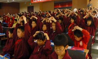 接着, Paul用动作引出了几个音标,并配上有趣的动作,上百名孩子跟着做动作,动作整齐有序,场面蔚为壮观。在模仿中,孩子们很快掌握了发音要领。