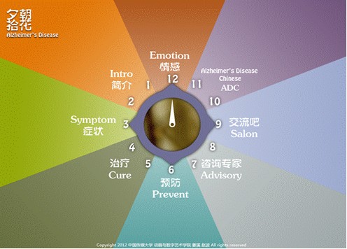 《朝花夕拾》是由吕欣、侯玥老师指导,姜溪、赵波同学设计完成的公益性新媒体交互式阅读作品。作品以iPad为媒介载体,将文字和数据可视化,以直观新颖的漫动画方式,对阿尔茨海默病(老年痴呆症)的相关知识进行了详细介绍,并通过作品的网络在线交流功能为阿尔茨海默病患者的看护者提供了一个沟通交流的平台。
