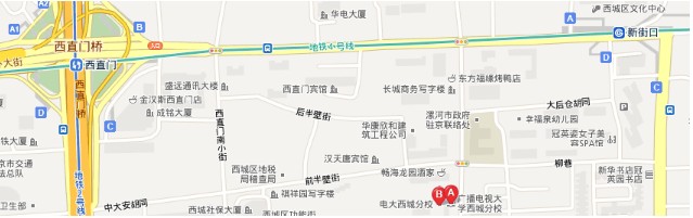 乘车路线:地铁四号线新街口站出D口(西南口)向西见红绿灯向南200米路西;地铁二号线西直门站出C口(东南口)走西直门内大街向东第二个红绿灯向南200米路西;105电车、111电车、608、7路公交车西直门内下车向东见红绿灯向南200米路西。(详见下图A)