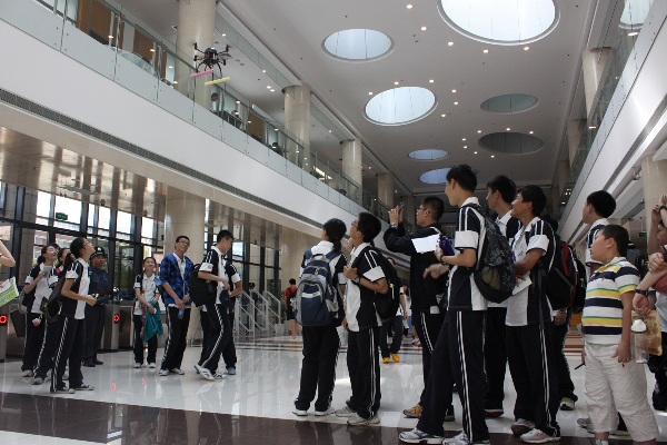 上海交通大学附属中学高一科技创新实验班学生赴上海交通大学闵行校区,参与了“瞭望科学”校园开放日活动。 在一天的活动时间中,同学们参观了致远学院,中意绿色能源实验室,图书信息楼,逸夫科技楼等地,聆听了数理、生物方面的讲座。这次的开放日活动让同学们感受到了交大浓厚的学术气氛和创新精神,令同学们受益颇多。 同学们在交大图书馆观摩航模飞行